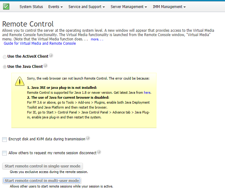 Lenovo IMM Remote Control Java JRE plugin error