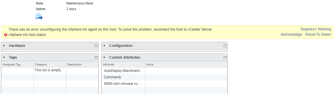 Have taken the host out of maintenance mode and immediately started showing the below error message in Summary tab –