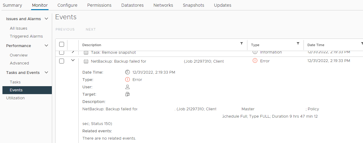 In our environment Netbackup throwed an error and when I looked at the VM, vROps VM NBU snapshot failing.